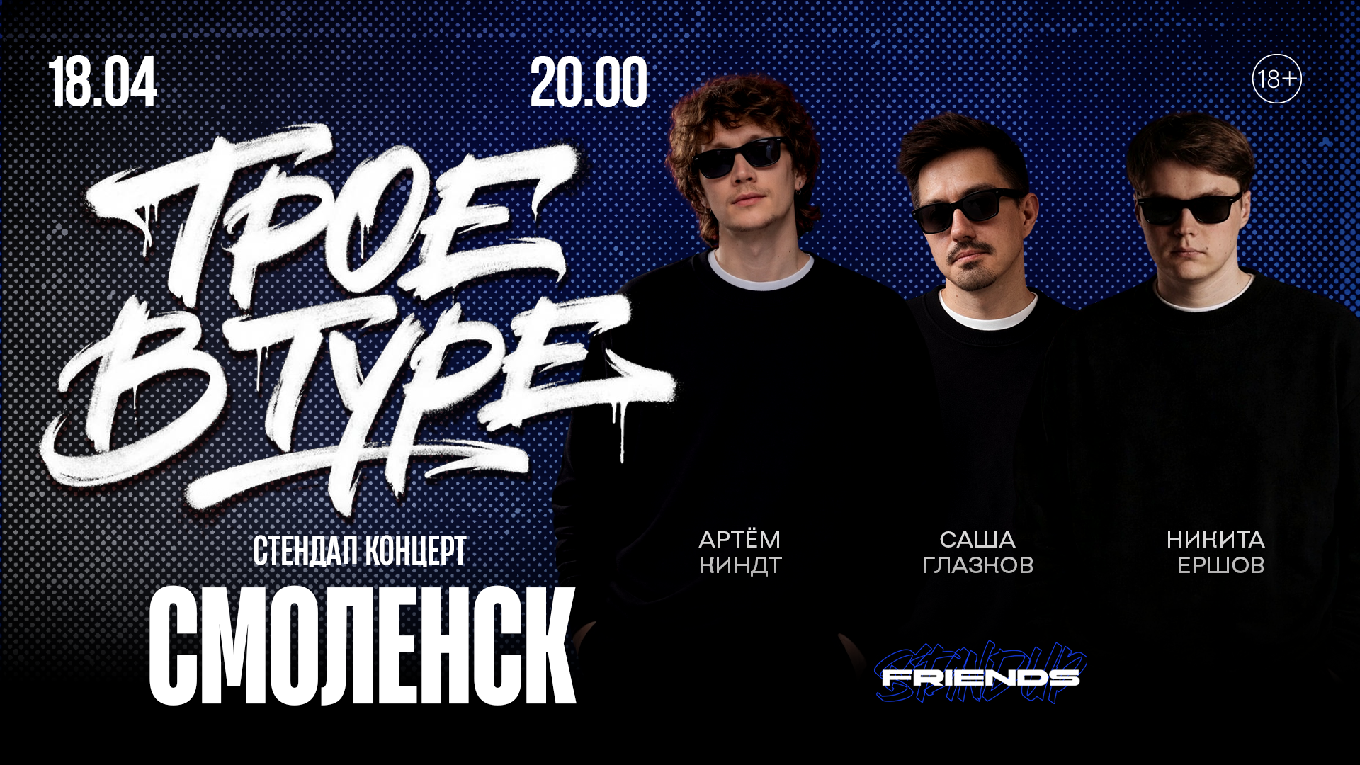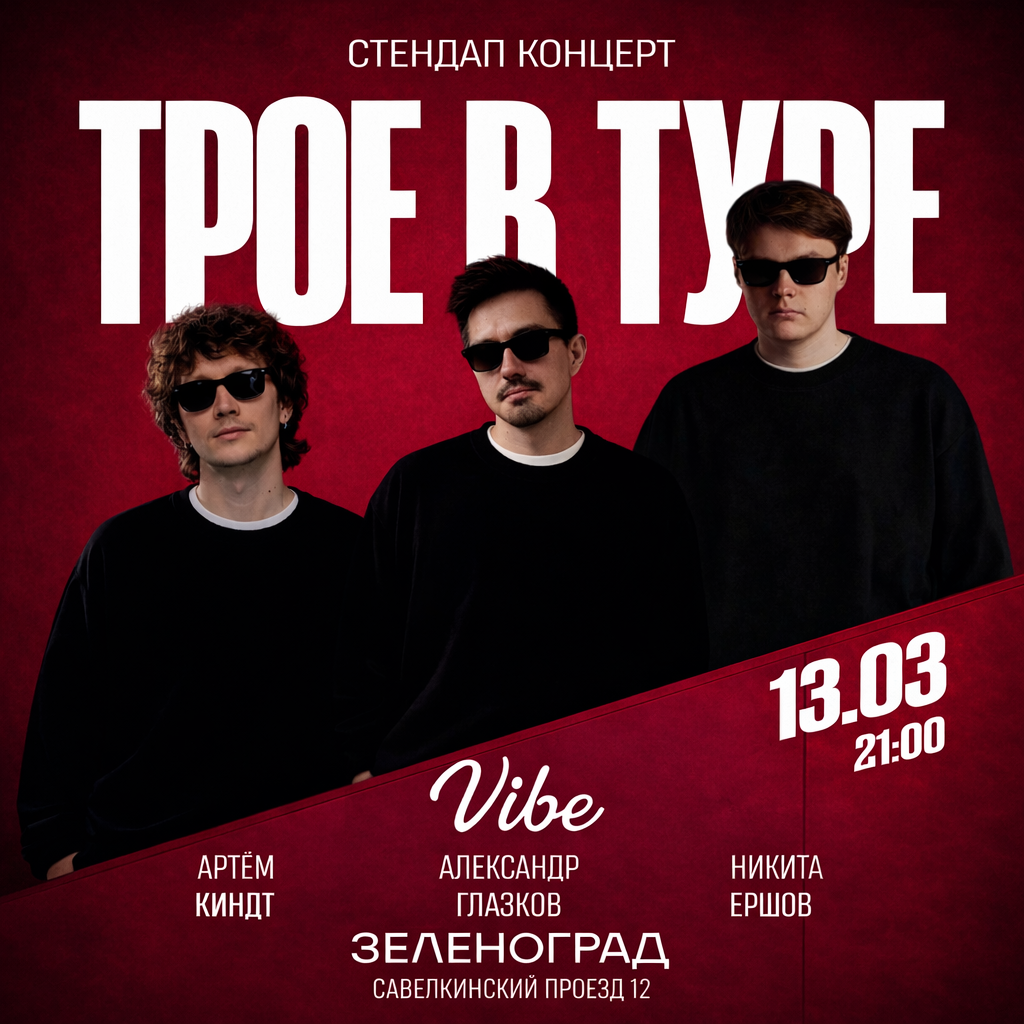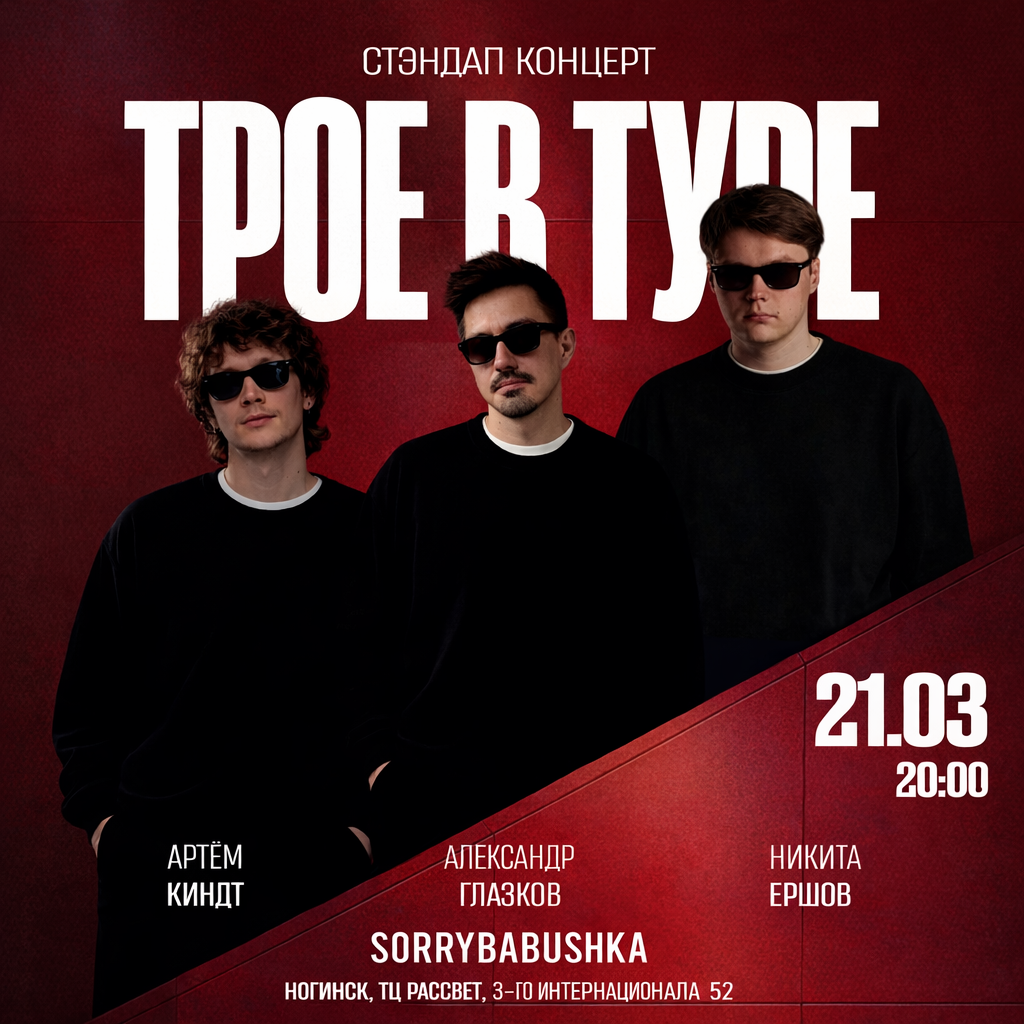 Это стендап-проект, объединивший трех комиков: Александра Глазкова, Никиту Ершова и Артема Киндта.